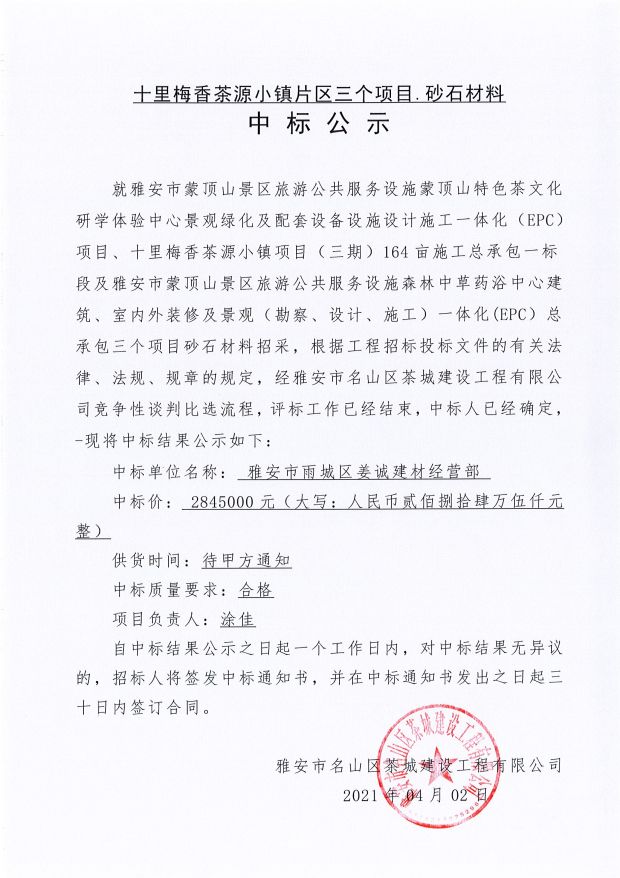 十里梅香茶源小鎮片區三個項目砂石材料中標公示