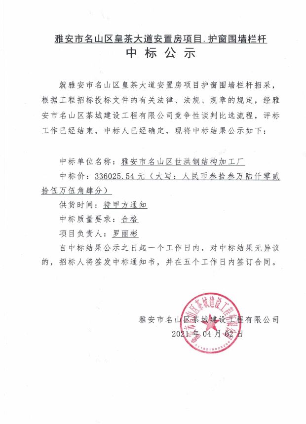 雅安市名山區(qū)皇茶大道安置房項目護窗圍墻欄桿中標(biāo)公示