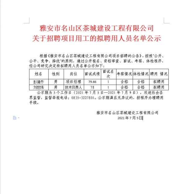 雅安市名山區茶城建設工程有限公司 關于招聘項目用工的擬聘用人員名單公示