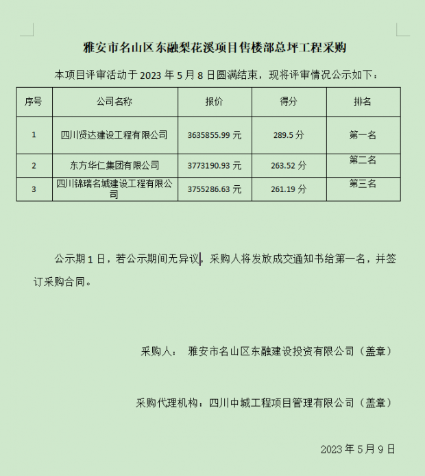 雅安市名山區天蒙路片區鄉村振興產業融合發展示范帶建設項目(一標段)設計施工總承包+運營標段勞務+機械采購項目招標結果公告...